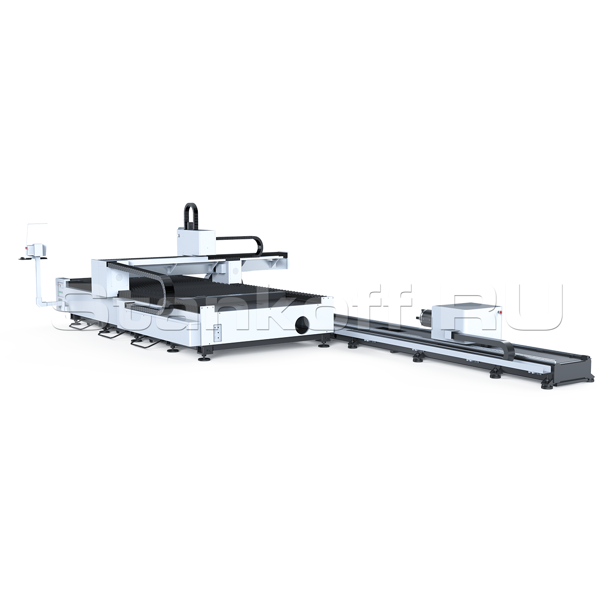 ЧПУ станка позволяет реализовать уменьшенный мёртвый остаток до 90мм по трубе. Портал перемещается в положение между задним и передним патроном труборезного модуля, труба остаётся зажатой только кулачками заднего патрона.